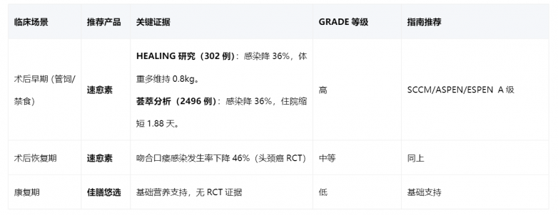 数据来源:ESPEN外科营养指南、SCCM/ASPEN危重症营养指南、HEALING研究(Chin Med J 2025)、头颈癌手术研究、多项荟萃分析及雀巢健康科学官方资料。