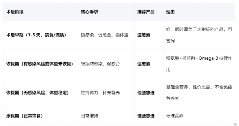 推荐:术后早期及恢复期用速愈素;康复期无感染风险、体重稳定者可用佳膳悠选(每日1-2杯),性价比高。